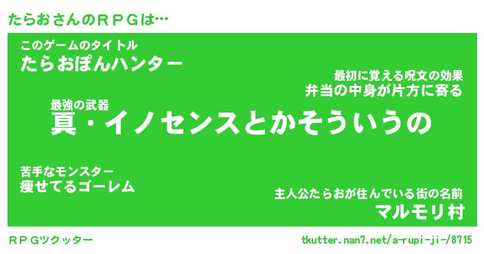 | 男性向けラノベタイトル風あだ名 | 『タラオアートオンライン』 |