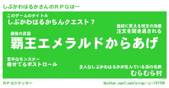 | 男性向けラノベタイトル風あだ名 | 『シブカワハルカアートオンライン』 |