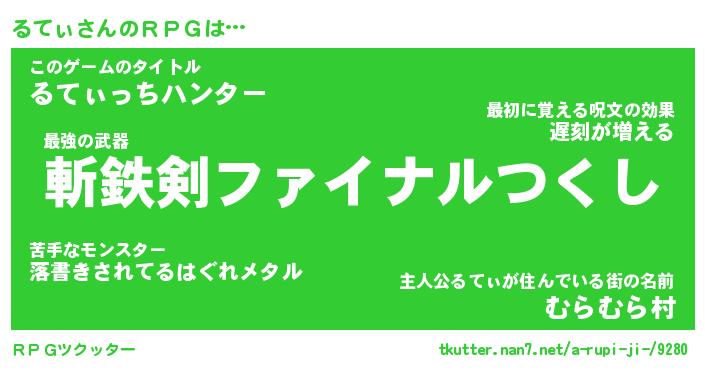 | 男性向けラノベタイトル風あだ名 | 『るてぃの憂鬱』 |