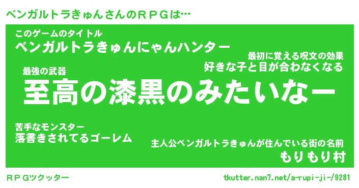 | 男性向けラノベタイトル風あだ名 | 『ベンガルトラキュンアートオンライン』 |