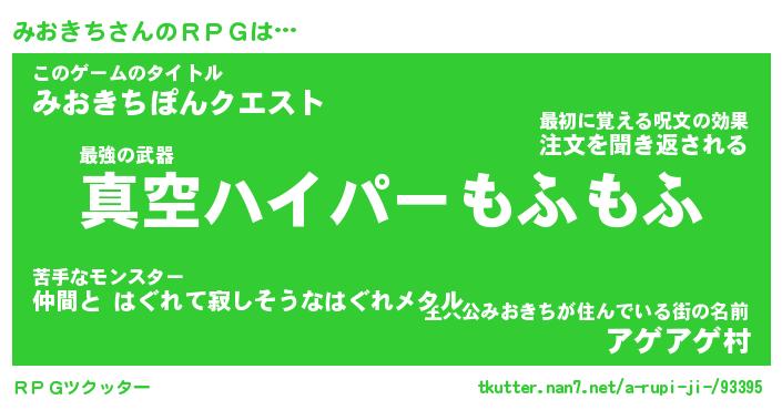 | 男性向けラノベタイトル風あだ名 | 『ミオキチアートオンライン』 |