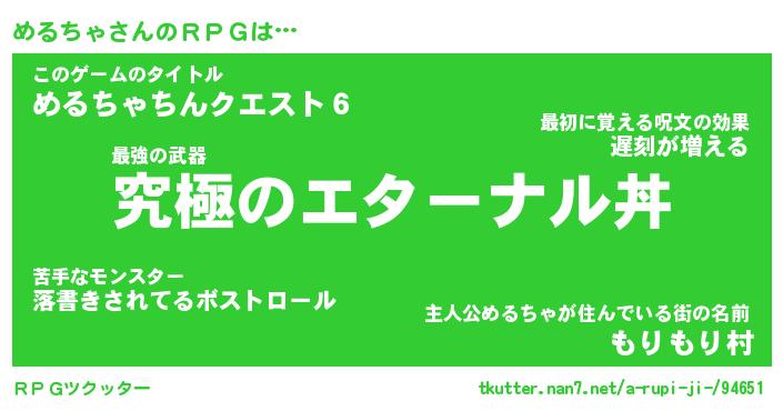 | 男性向けラノベタイトル風あだ名 | 『めるちゃの憂鬱』 |