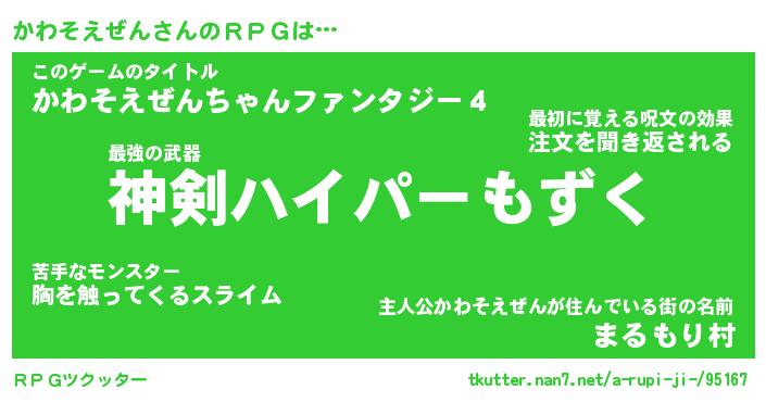 | 男性向けラノベタイトル風あだ名 | 『かわそえぜんの憂鬱』 |