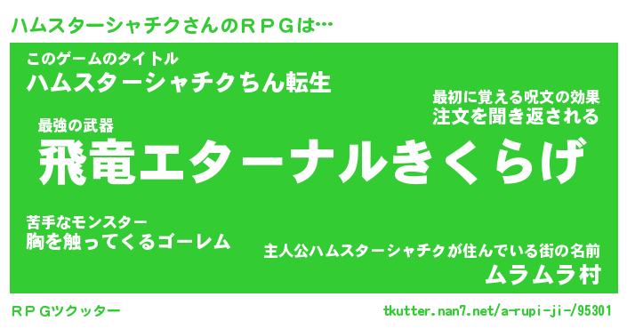 | 伝説のあだ名 | 『封印されし傭兵ハムスターシャチク』 |