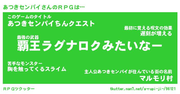 | 男性向けラノベタイトル風あだ名 | 『アツキセンパイアートオンライン』 |