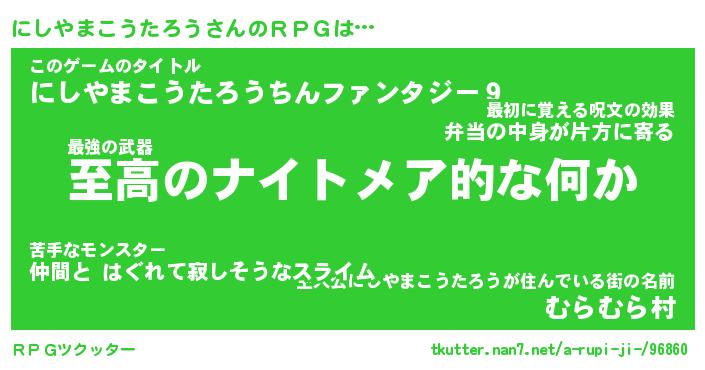 | 胡散臭い通販商品みたいなあだ名 | 『モテモテ間違いなし霊験あらたかなお札…その名も「にしやまこうたろう」』 |
