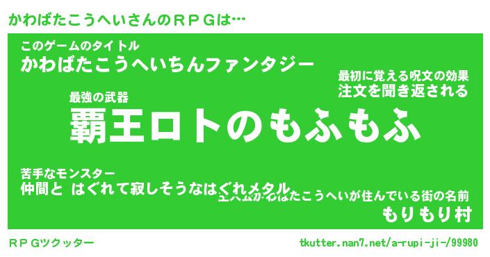 | 男性向けラノベタイトル風あだ名 | 『カワバタコウヘイアートオンライン』 |