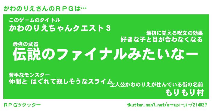 | 男性向けラノベタイトル風あだ名 | 『かわのりえの憂鬱』 |