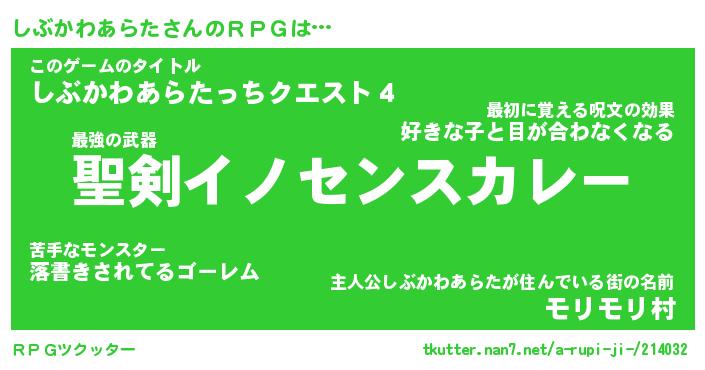 | 男性向けラノベタイトル風あだ名 | 『しぶかわあらたの憂鬱』 |