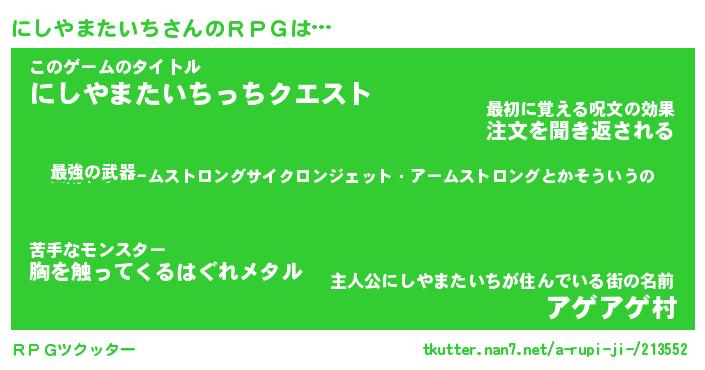 | 男性向けラノベタイトル風あだ名 | 『にしやまたいちの憂鬱』 |