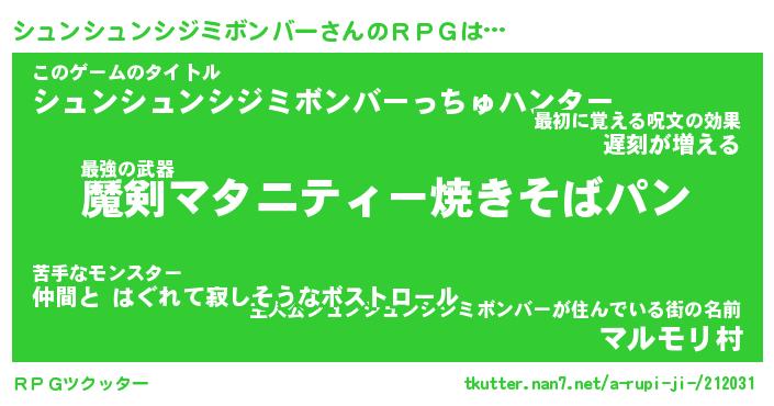 | 男性向けラノベタイトル風あだ名 | 『シュンシュンシジミボンバーの憂鬱』 |