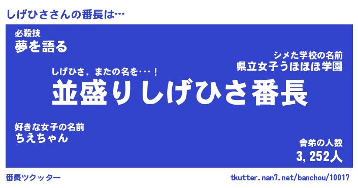 | 意味不明あだ名 | 『ペロリンしげひさ』『永久保存しげひさ』 |