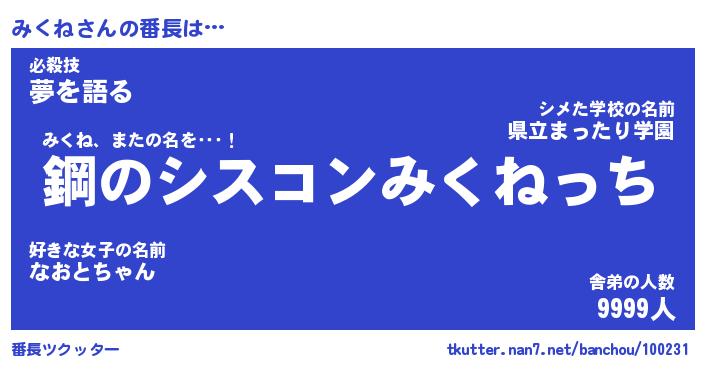 | ヒーロー風カッコイイあだ名 | 『スーパーミクネ』『ウルトラみくねマン』 |