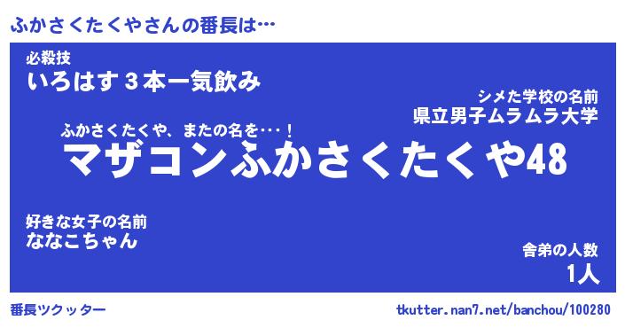 | 伝説のあだ名 | 『封印されしスナイパーふかさくたくや』 |