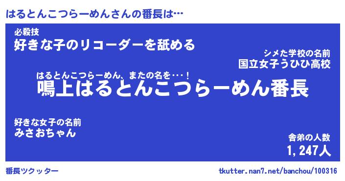 | 意味不明あだ名 | 『ペロリンはるとんこつらーめん』 |