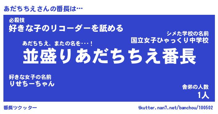| 肩書あだ名 | 『あだちちえ店長』『あだちちえ国家主席』 |