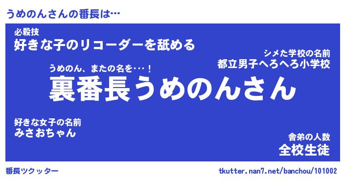 | ヒーロー風カッコイイあだ名 | 『スーパーウメノン』『暗黒騎士ウメ』 |