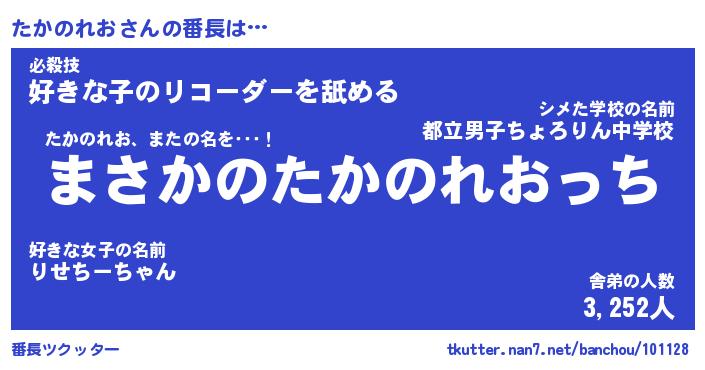 | 肩書あだ名 | 『たかのれお店長』『たかのれお国家主席』 |