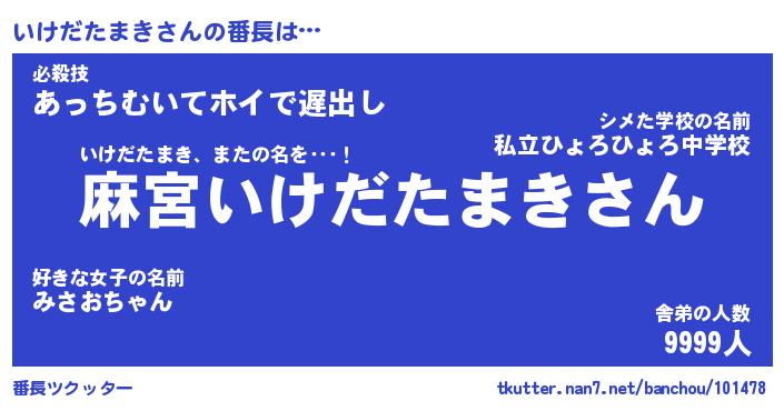 | ヘコむあだ名 | 『いけにゅー』『つくし』『いけ太郎』 |