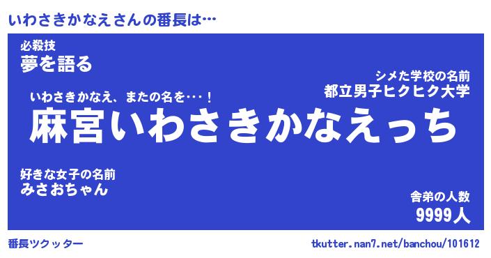 | ヘコむあだ名 | 『いわにゅー』『酢こんぶ』『いわお』 |