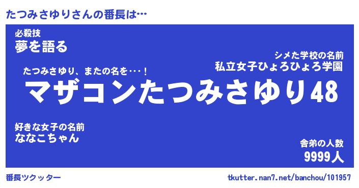 | 肩書あだ名 | 『たつみさゆり店長』『たつみさゆり団長』 |