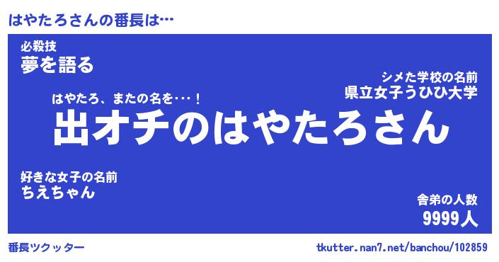 | 肩書あだ名 | 『はやたろ社長』『はやたろ総理大臣』 |