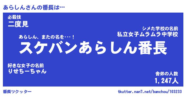 | 意味不明あだ名 | 『ペロリンあらしん』『永久保存あらしん』 |