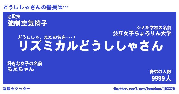 | 肩書あだ名 | 『どうししゃ御曹司』『どうししゃ団長』 |