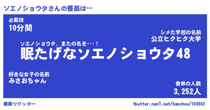 | 伝説のあだ名 | 『封印されしスナイパーソエノショウタ』 |