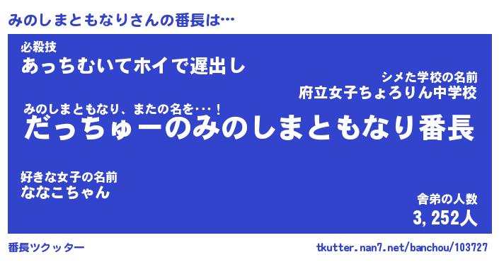 | 男性向けラノベタイトル風あだ名 | 『みのしまともなりの憂鬱』 |