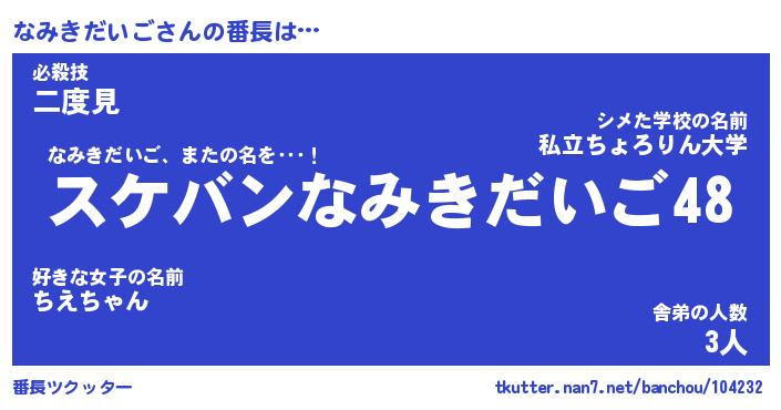 | ヒーロー風カッコイイあだ名 | 『スーパーナミキダイゴ』『銀牙騎士ナミ』 |