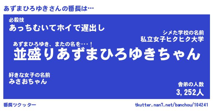 | 恥ずかしいあだ名 | 『プリティーあずまひろゆき』『あずちん』 |