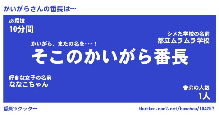 | ヒーロー風カッコイイあだ名 | 『スーパーカイガラ』『黄金騎士カイ』 |