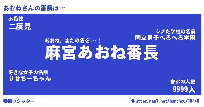 | 伝説のあだ名 | 『不死鳥のスナイパーあおね』 |