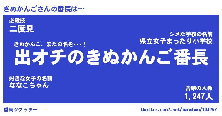 | 男性向けラノベタイトル風あだ名 | 『きぬかんごの憂鬱』 |