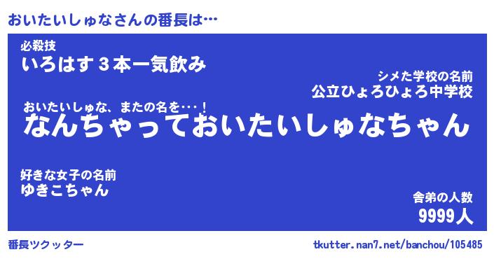 | 伝説のあだ名 | 『伝説のスナイパーおいたいしゅな』 |