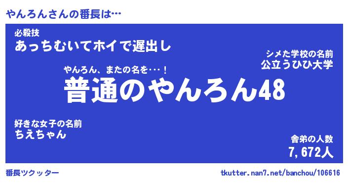 | 意味不明あだ名 | 『ペロリンやんろん』『永久保存やんろん』 |