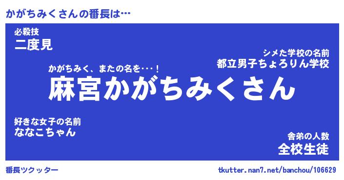 | 肩書あだ名 | 『かがちみく御曹司』『かがちみく団長』 |