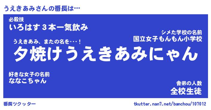 | 肩書あだ名 | 『うえきあみ社長』『うえきあみ総理大臣』 |