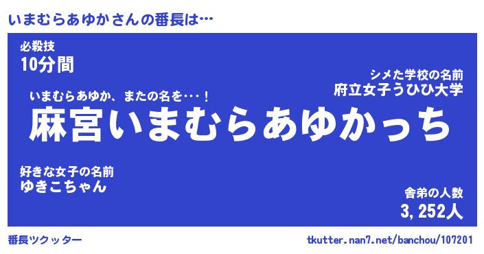 | 恥ずかしいあだ名 | 『プリティーいまむらあゆか』『いまちん』 |
