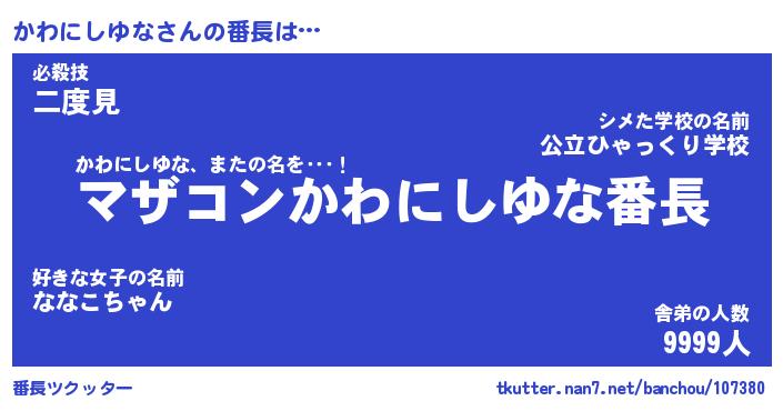 | 肩書あだ名 | 『かわにしゆな社長』『かわにしゆな教頭』 |