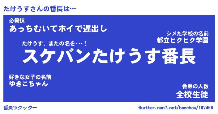 | ファンタジー風あだ名 | 『タケフェル』『エターナルタケウスー』 |
