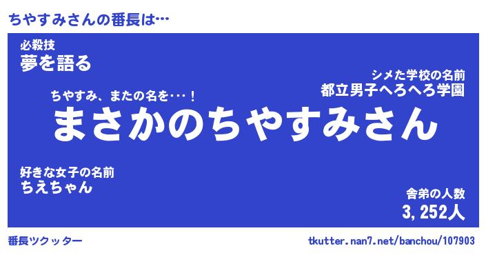 | 肩書あだ名 | 『ちやすみ店長』『ちやすみ総理大臣』 |