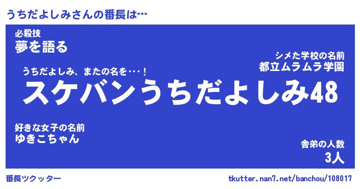 | ヒーロー風カッコイイあだ名 | 『スーパーウチダヨシミ』『暗黒騎士ウチ』 |
