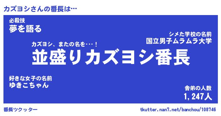 | 意味不明あだ名 | 『ペロリンカズヨシ』『永久保存カズヨシ』 |