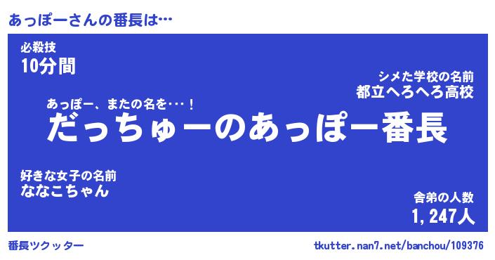 | 意味不明あだ名 | 『ペロリンあっぽー』『永久保存あっぽー』 |