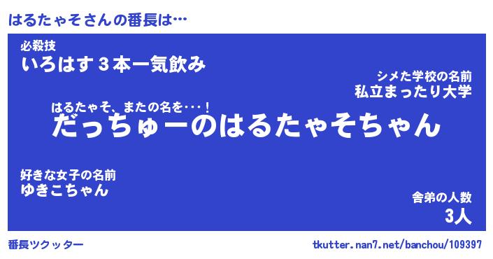 | 伝説のあだ名 | 『伝説のスナイパーはるたゃそ』 |