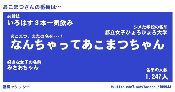 | 肩書あだ名 | 『あこまつ社長』『あこまつ国家主席』 |
