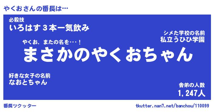 | 意味不明あだ名 | 『ペロリンやくお』『やくおフォーエバー』 |