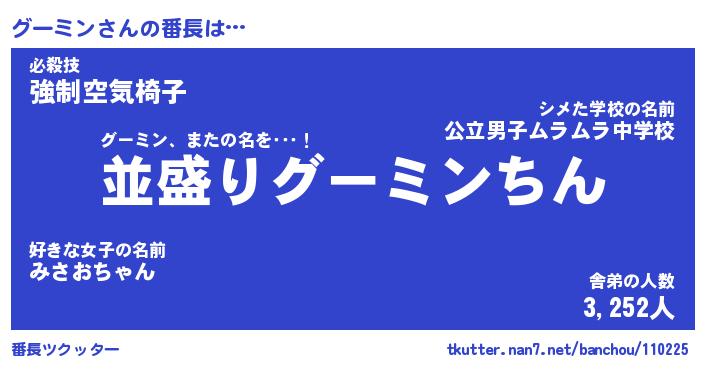 | 男性向けラノベタイトル風あだ名 | 『グーミンの憂鬱』 |